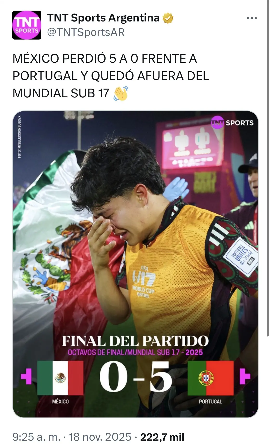 Sin embargo, el destino le dio una oportunidad de revancha virtual a la prensa argentina. Luego de que la Selección Mexicana Sub-17 fuera goleada 5-0 por Portugal en la fase de octavos de final y quedara eliminada del Mundial, el medio TNT Sports Argentina no dudó en aprovechar la ocasión para cobrarse la afrenta.