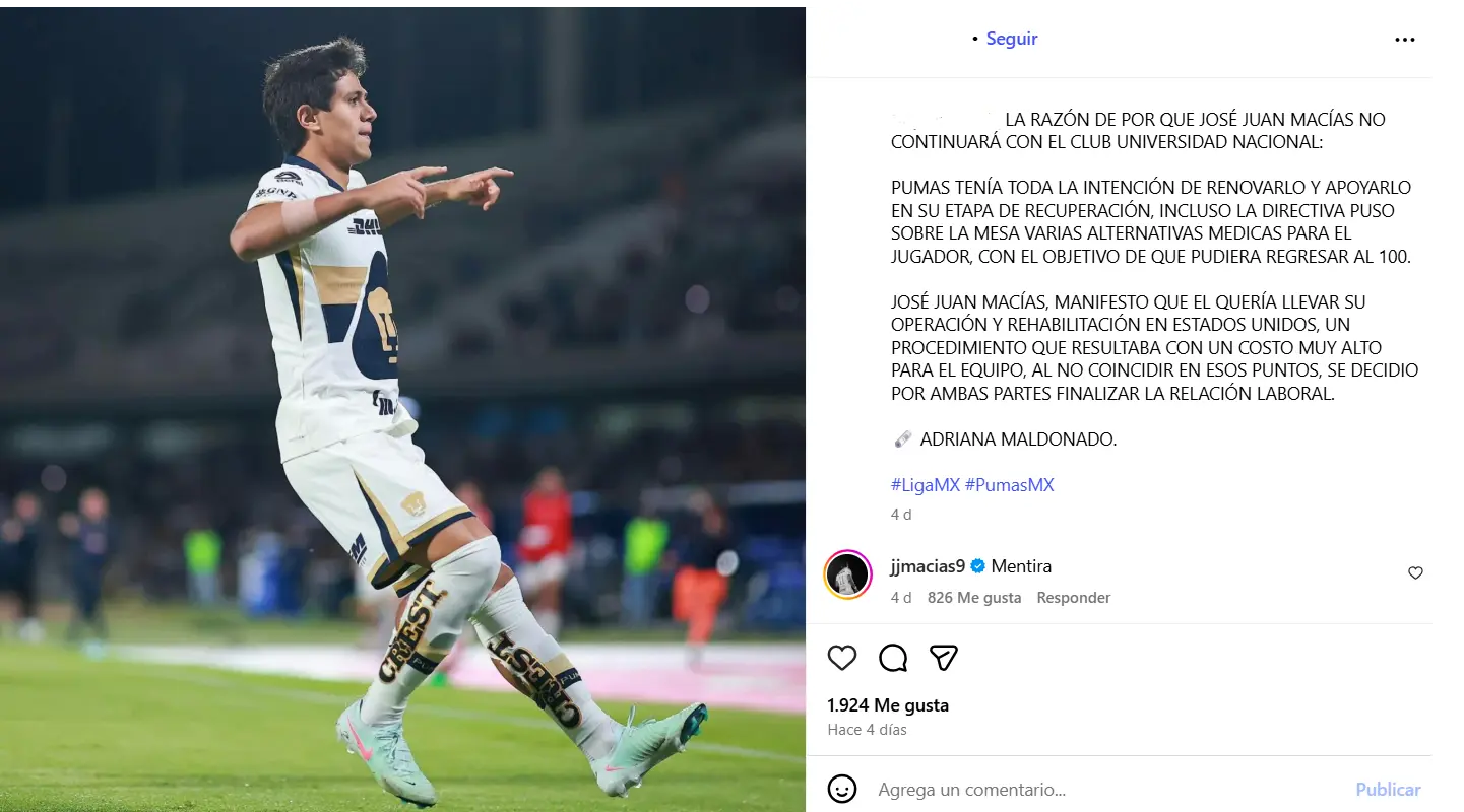 José Juan Macías, el delantero mexicano que ha enfrentado una serie de lesiones en su carrera, ha salido al paso de los rumores que rodean su salida de los Pumas de la UNAM, desmintiendo que su decisión de recuperarse en Estados Unidos haya sido el detonante para que el club no renovara su contrato.