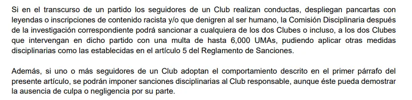 El Apéndice V del Reglamento de Sanciones de la FMF, en el apartado de Discriminación y Racismo, establece que si los aficionados incurren en conductas racistas, el club puede ser sancionado con una multa de hasta 6,000 UMAs, incluso sin necesidad de probar culpa o negligencia. Es decir, responsabilidad directa.