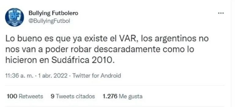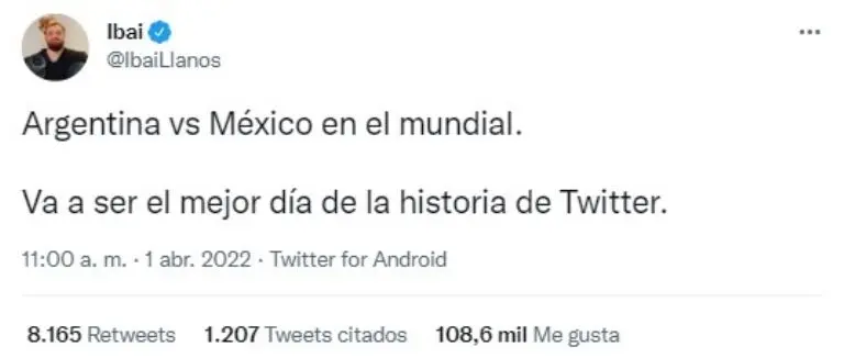 Como muestra de la gran expectativa que ha despertado ese partido por los antecedentes entre ambos equipos y la picardía y pasión de los hinchas de ambos países, el tuit del popular streamer español Ibai Llanos.