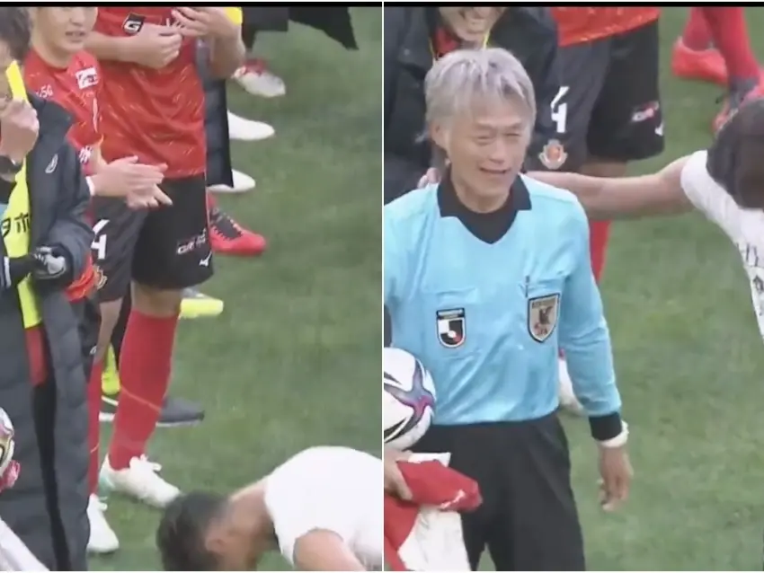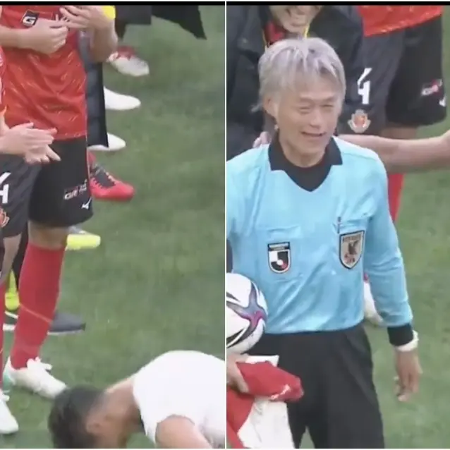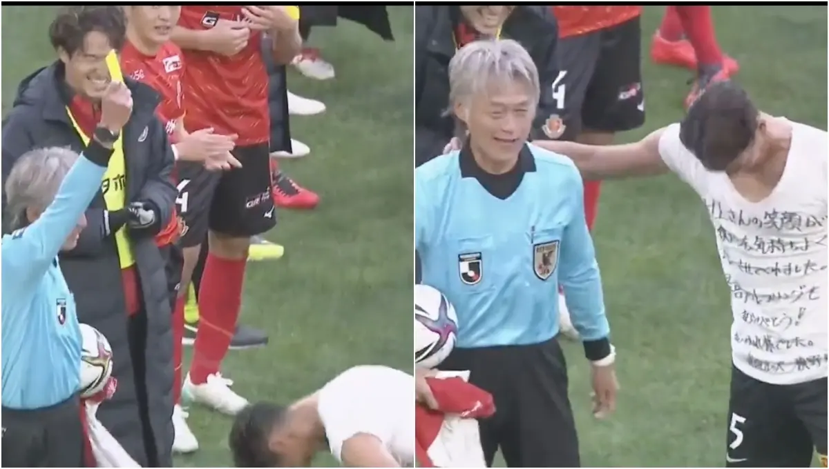 El árbitro Nobutsugu Murakami recibió un peculiar homenaje tras pitar el último partido de su carrera.