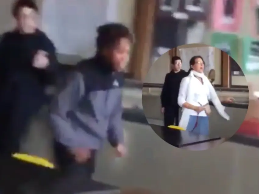 Fue con el estudiante que golpeó a la maestra, con quien se lanzó de manera inmediata gritándole que "con la maestra no", situación que lo llevó a ser detenido por el resto de sus compañeros y permitir que el agresor se levantara de suelo.