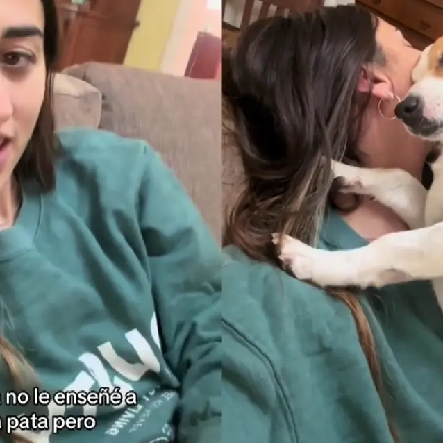 Luego de que entiende lo que le están pidiendo al repetir la frase ´¿cómo me das un abrazo?´ pone sus patas delanteras sobre el regazo de su dueña y se acurruca un poco para que ella sienta el contacto, incluso pega su cabeza con la de ella.