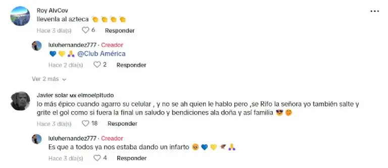 El video de la abuelita que se volvió viral por celebrar la victoria del América ya tiene 13 mil 600 likes y más de 400 comentarios donde se aparecieron los americanistas a halagar a la señora, ya que incluso les recordó a sus viejitas, y esperan que les traiga la buena suerte para alcanzar el bicampeonato también.