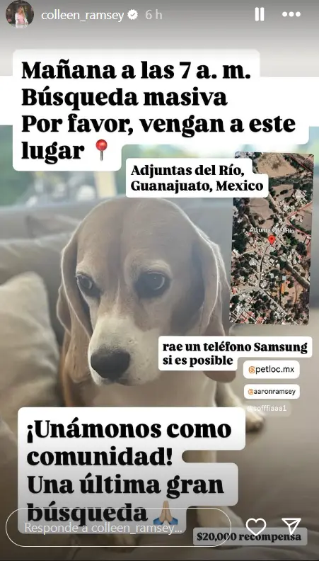 La desesperación ha escalado y es por eso que ahora han lanzado una convocatoria en redes sociales para salir en búsqueda de su perrita, donde además piden a los voluntarios llevar un celular samsung de preferencia, además de recordarle a sus seguidores que hay una gran recompensa de por medio.