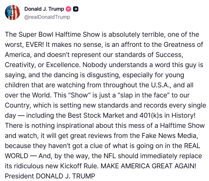 "El show de medio tiempo del Super Bowl es absolutamente terrible, ¡uno de los peores de la HISTORIA! No tiene sentido, es una afrenta a la grandeza de Estados Unidos y no representa nuestros estándares de éxito, creatividad o excelencia. Nadie entiende ni una palabra de lo que dice este tipo, y el baile es asqueroso, especialmente para los niños pequeños que están viendo esto en todo EE. UU. y en el mundo entero.