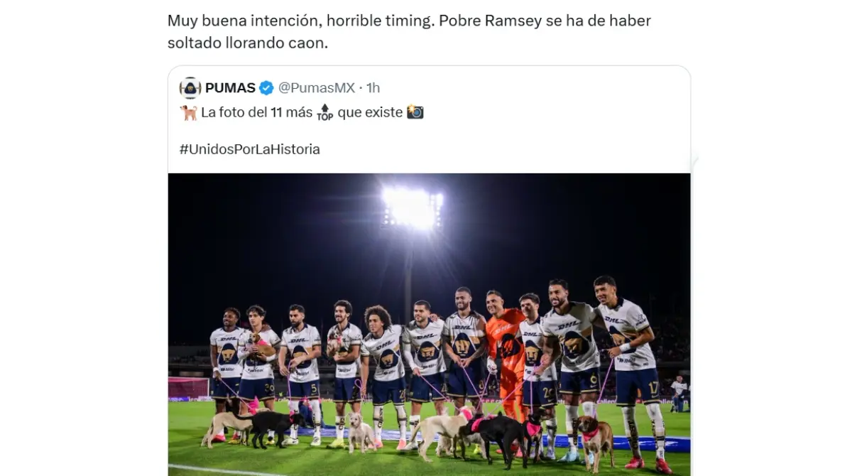 Las redes sociales se encendieron cuando los futbolistas de Pumas saltaron a la cancha del EOU con perritos Redes socialesEsto con el fin de promover la adopción de perros de compañía, una campaña que ya habían hecho otros equipos Redes socialesSin embargo, los aficionados tuvieron cierto descontento con el club, debido a la falta de empatía con Aaron Ramsey Redes socialesY es que el futbolista galés perdió a su perrita Halo hace un par de días Redes socialesY aunque ha ofrecido una gran recompensa por ella, no han podido dar con su paredero Redes socialesY ahora, los aficionados señalan al club de no ayudar a su jugador y lanzar esta campaña Redes socialesAunque algunos justifican esta acción, otros más han lanzado fuertes críticas en redes sociales Redes sociales Redes sociales Redes sociales Redes sociales Redes sociales Redes sociales