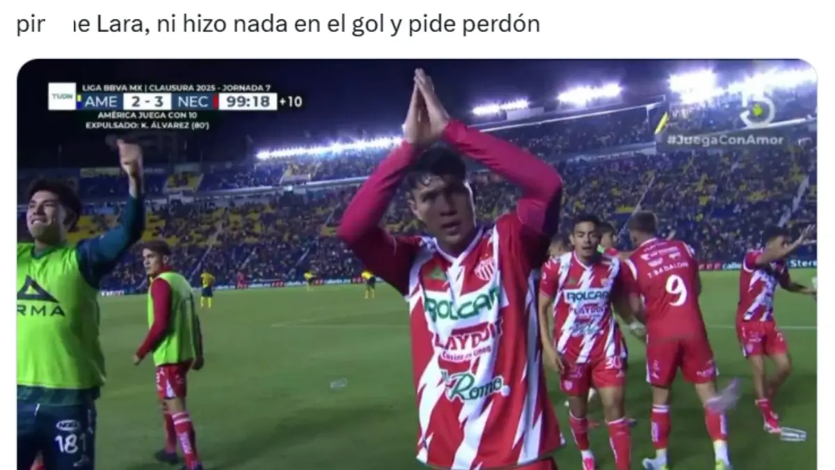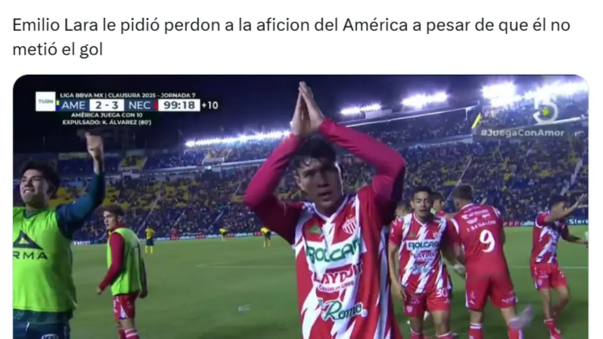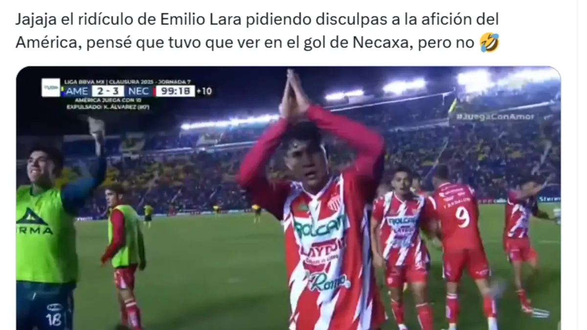 Emilio Lara fue víctima de los memes tras pedirle perdón al América en la victoria del Necaxa. Redes socialesEl canterano del América no participó en el gol de la victoria de los 'Rayos' pero eso no impidió que se disculpara. Redes socialesMuchos aficionados tacharon de 'rídiculo' o 'lamentable' al exfutbolista del América. Redes socialesLos memes no se hicieron esperar y lo acabaron con burlas de todo tipo. Redes sociales Redes sociales Redes sociales Redes sociales Redes sociales Redes sociales Redes sociales Redes sociales Redes sociales